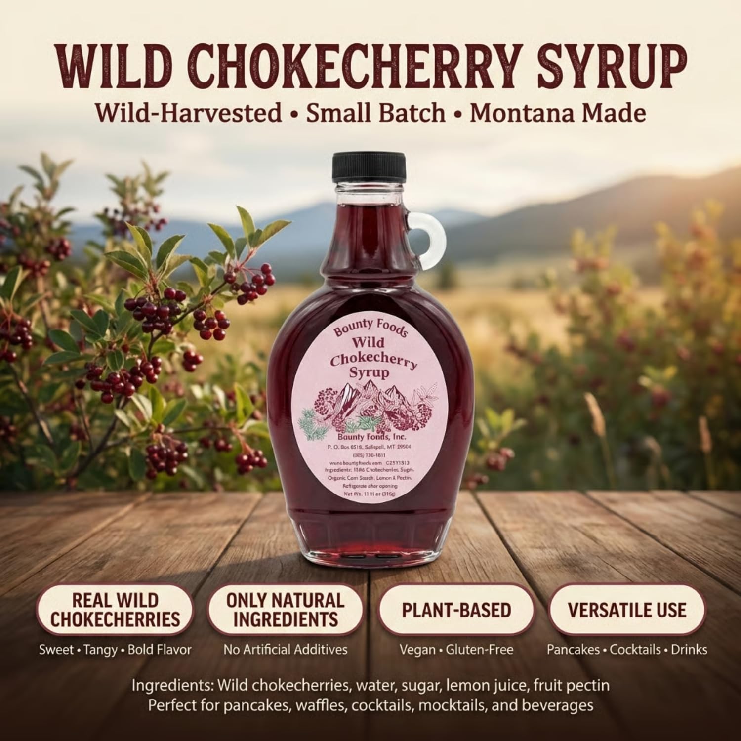 Introducing Montana Chokecherry Syrup - the all-natural and delicious syrup made from wild-grown chokecherries. Our syrup is crafted with care and precision to bring you a unique sweetness and flavor that's unparalleled. Made with only the finest wild-grown chokecherries, our syrup is perfect for breakfast, cocktails, and more. Made with all-natural ingredients, our chokecherry syrup is free from any artificial additives or preservatives. Infused with real sweetness, natural colors, and a unique flavor, it's a perfect topping for pancakes, waffles, and other breakfast treats. Plus, chokecherries are rich in antioxidants and other beneficial nutrients, making our syrup a healthier alternative to traditional syrups. Our chokecherry syrup is versatile and delicious - use it to enhance your favorite beverages, cocktails, and mocktails. Whether you're mixing up a signature cocktail or creating a delicious mocktail, our syrup is the perfect addition to any drink. Plus, it's the ultimate ingredient for adding a unique twist to your recipes. Let your culinary imagination run wild with Montana chokecherry syrup! Our chokecherry syrup comes in a sturdy and attractive bottle that preserves the natural colors and flavor of the syrup. It's convenient and durable packaging ensures that it arrives at your doorstep in perfect condition. Plus, our syrup is proudly made in Montana using traditional recipes and methods, making it a perfect gift or souvenir. Taste the pure, natural flavor of wild chokecherry syrup - it's a sweet and tangy taste sensation that's perfect for cocktails, breakfast, and so much more. Our chokecherry syrup is a healthier and all-natural choice that satisfies your sweet tooth with a truly unique taste. Add to cart now and experience the wild taste of Montana chokecherry syrup!