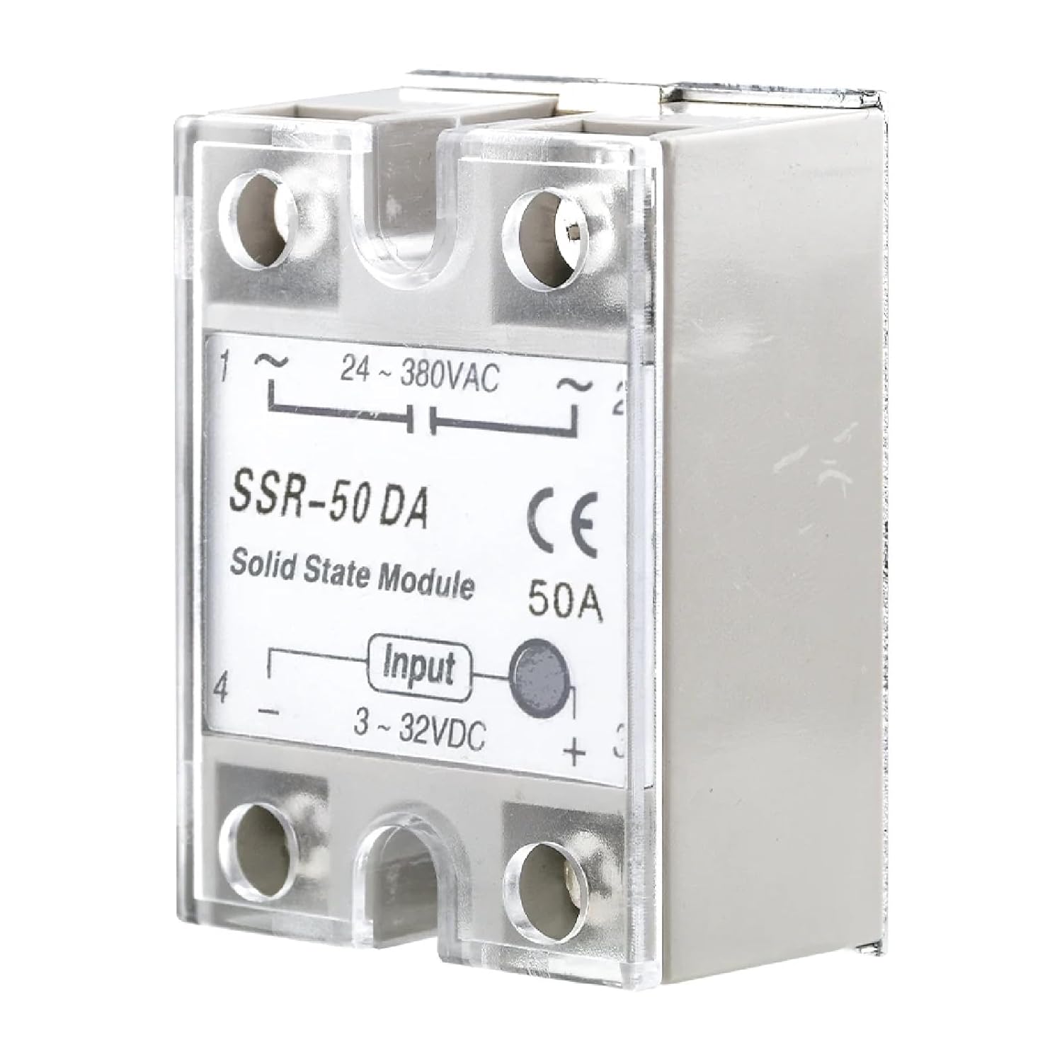 The SSR-50 DA Single Phase Solid State Relay is a reliable and versatile switching module designed for a wide range of industrial and general-purpose applications. With a robust 50A current rating, this relay accepts a low-voltage DC input ranging from 3V to 32V and seamlessly controls high-voltage AC loads from 24V to 380V, making it suitable for demanding electrical control systems. Its solid-state design means there are no moving parts, resulting in silent operation and an extended service life compared to traditional mechanical relays. The compact, sealed construction protects internal components and ensures consistent performance across various operating environments. Clear terminal labeling on the housing makes wiring straightforward for both input and output connections. This module is well-suited for use in temperature controllers, automation systems, and other switching applications where precise and dependable control is essential. Please ensure your application's voltage and current requirements are within the specified ratings before installation.